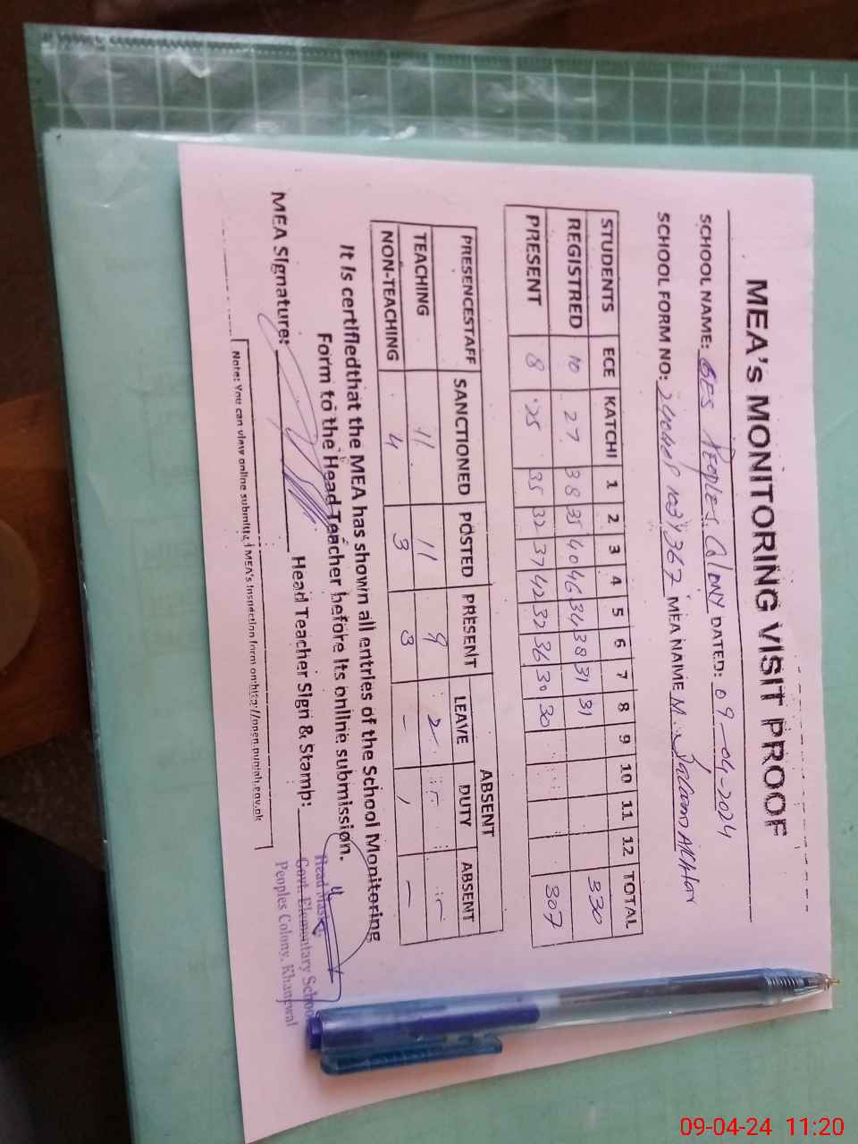 | Attendance Register | Head Teacher | MEA with School | Visit Proof |