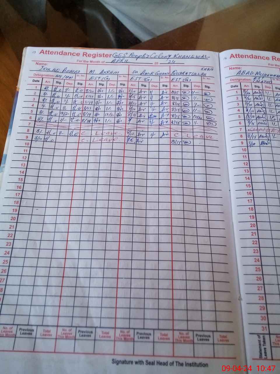 | CNIC | Full Name | Designation | R/C | Absence During Last Calender Month |