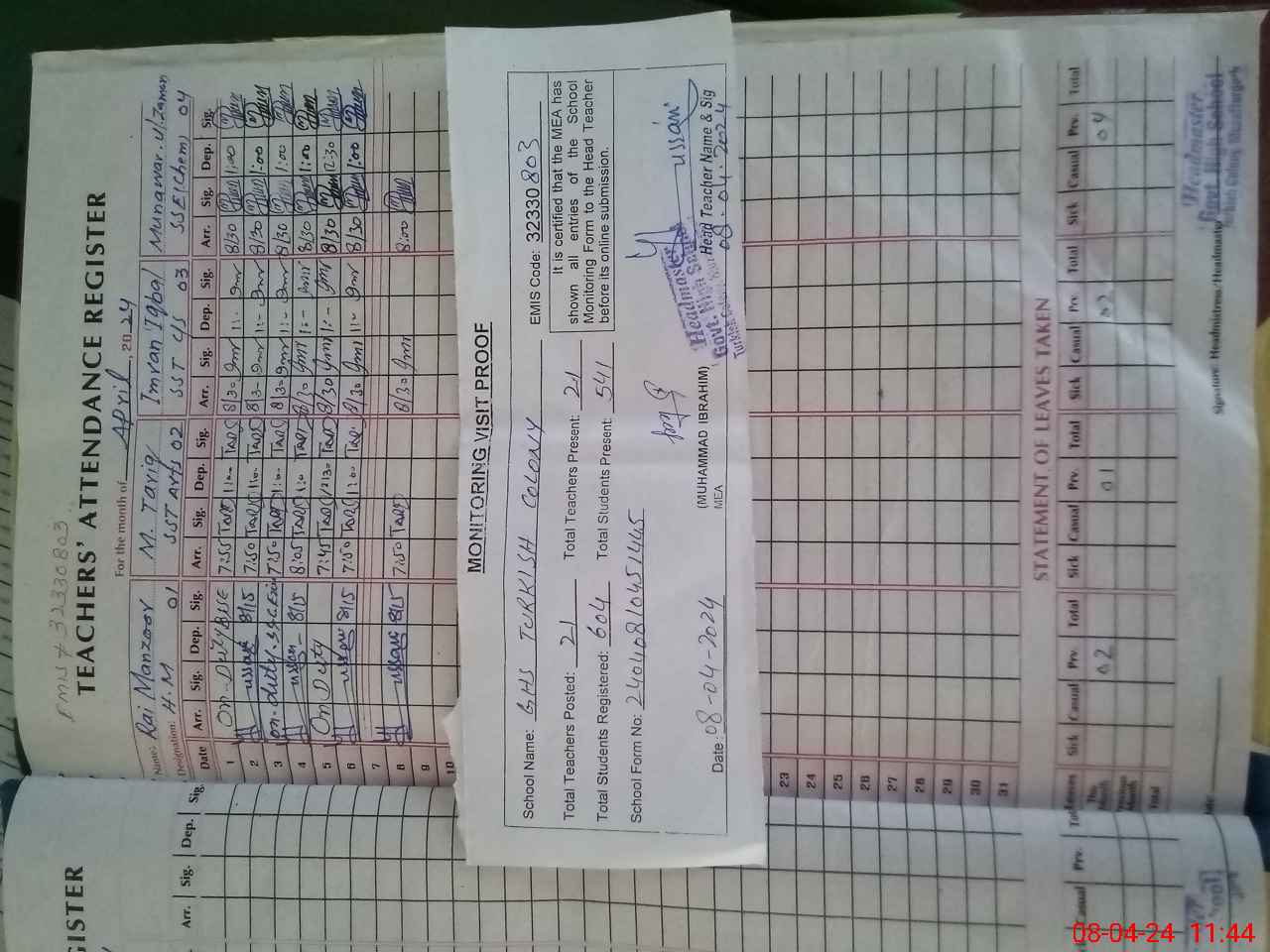 | Attendance Register | Head Teacher | MEA with School | Visit Proof |