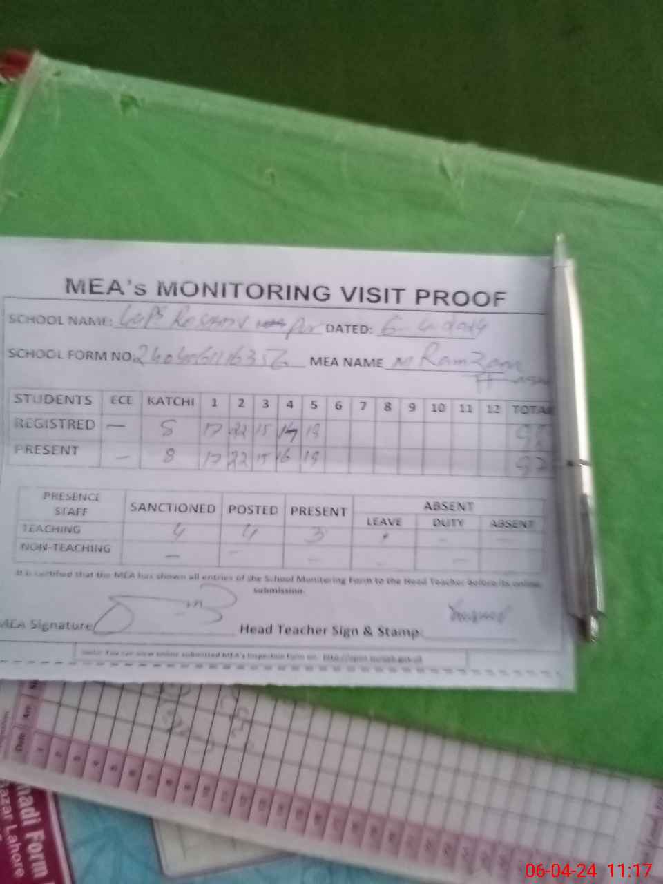 | Attendance Register | Head Teacher | MEA with School | Visit Proof |