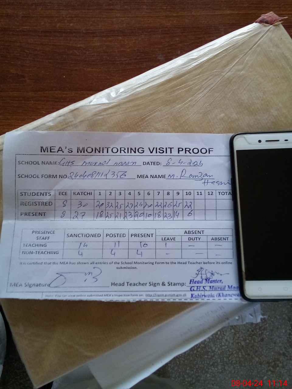 | Attendance Register | Head Teacher | MEA with School | Visit Proof |