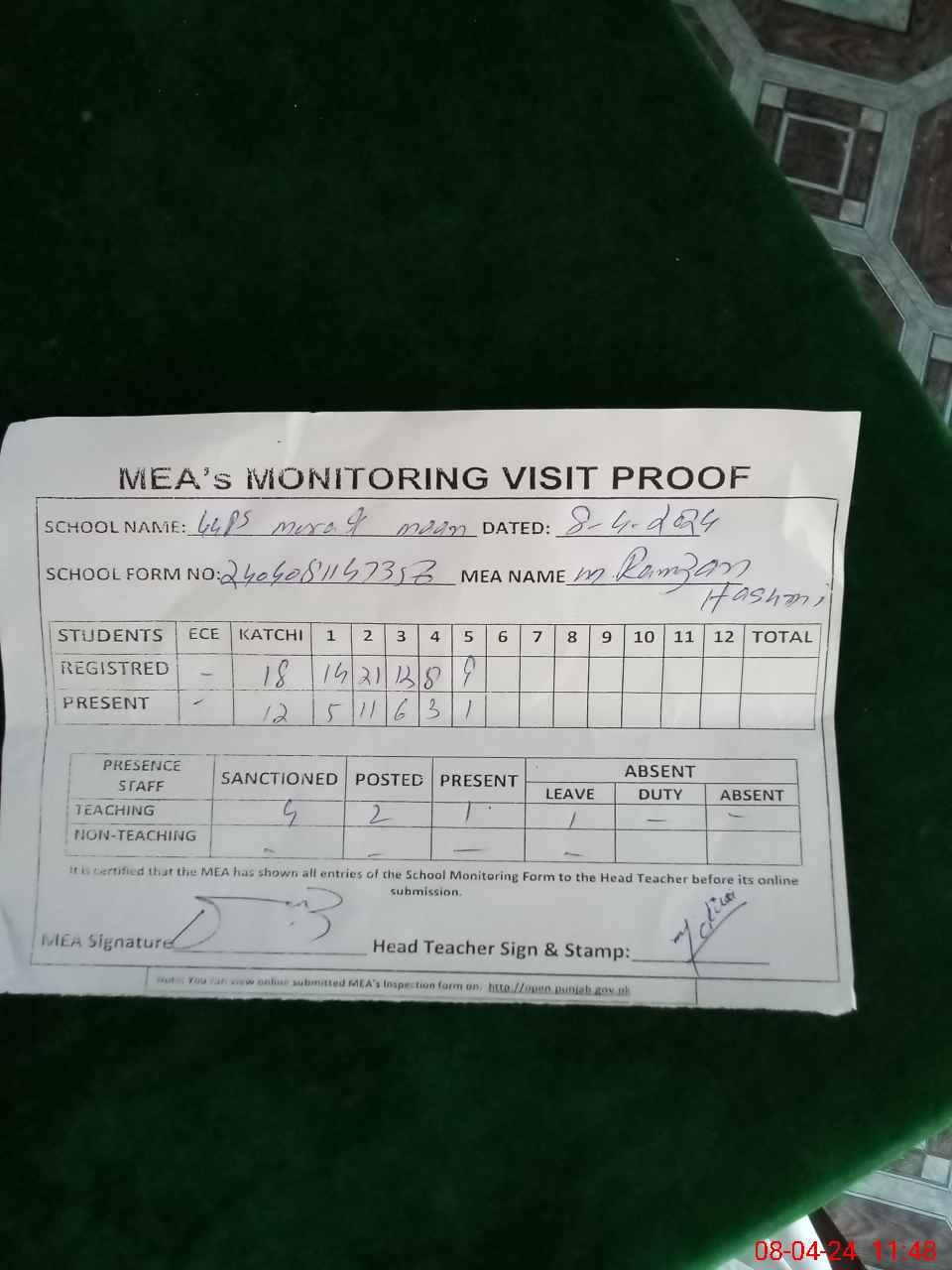 | Attendance Register | Head Teacher | MEA with School | Visit Proof |