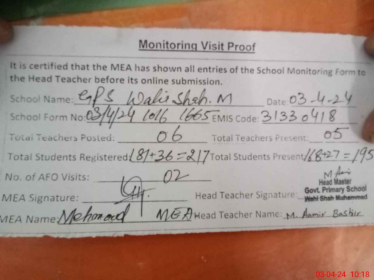 | Attendance Register | Head Teacher | MEA with School | Visit Proof |