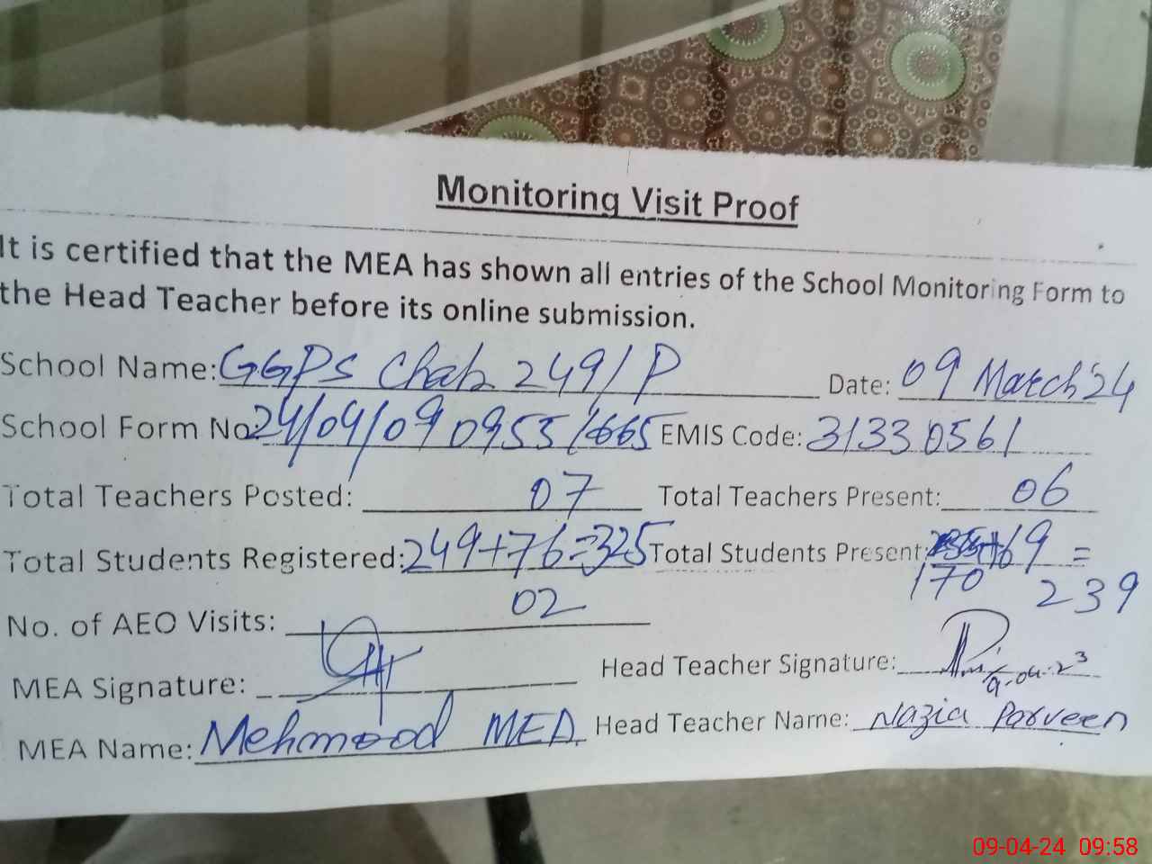 | Attendance Register | Head Teacher | MEA with School | Visit Proof |