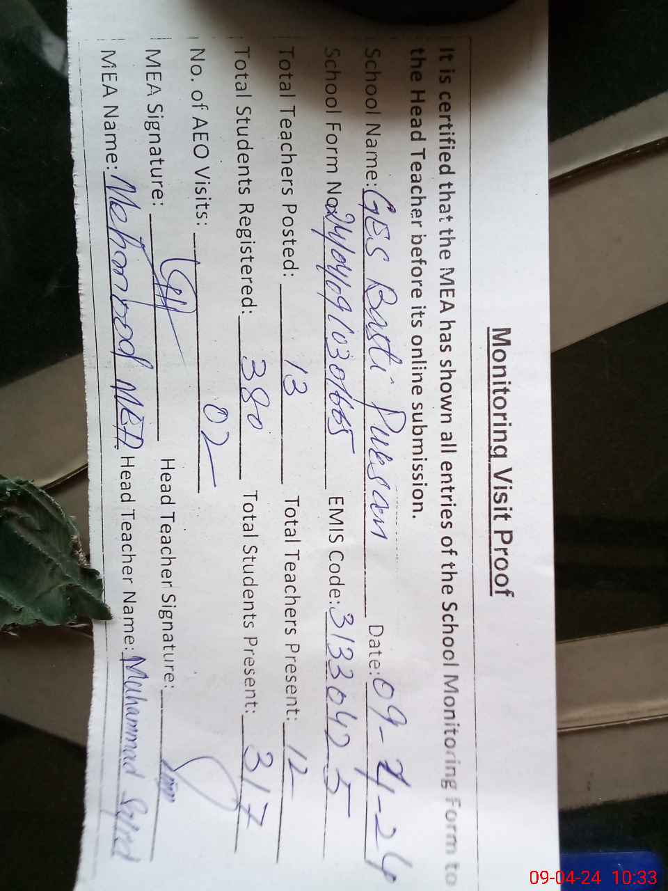 | EMIS Code: 31330425 | Name of School: GES BASTI PURSAN | |||
