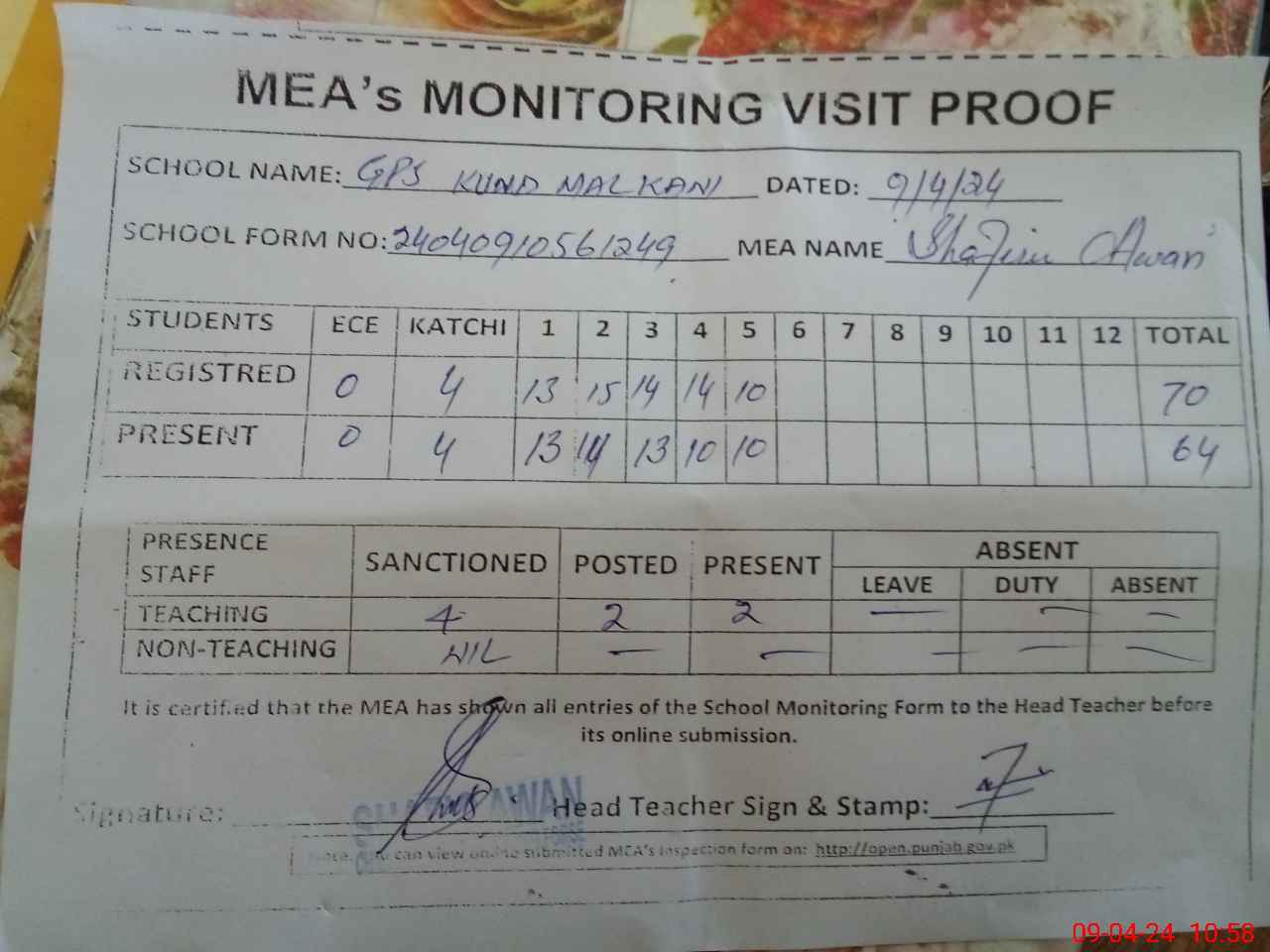 | Attendance Register | Head Teacher | MEA with School | Visit Proof |