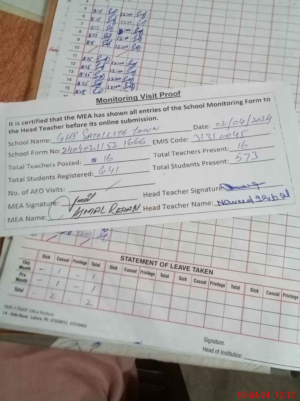 | Attendance Register | Head Teacher | MEA with School | Visit Proof |