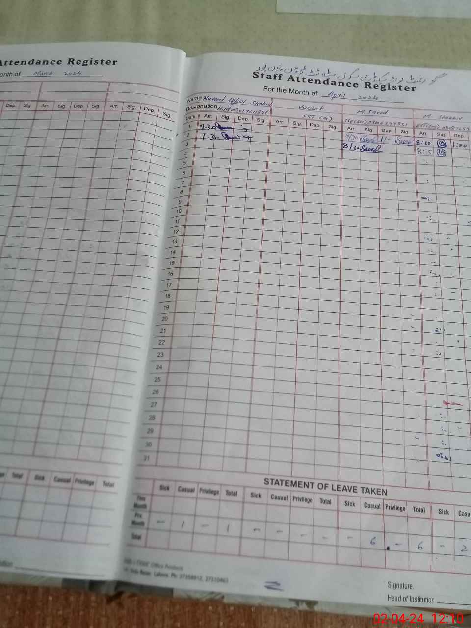 | Name: Na**** Iq**** Sh**** Designation: (School Headmaster's/Headmistress's) Head Master Phone/Cell Number: 03**** |