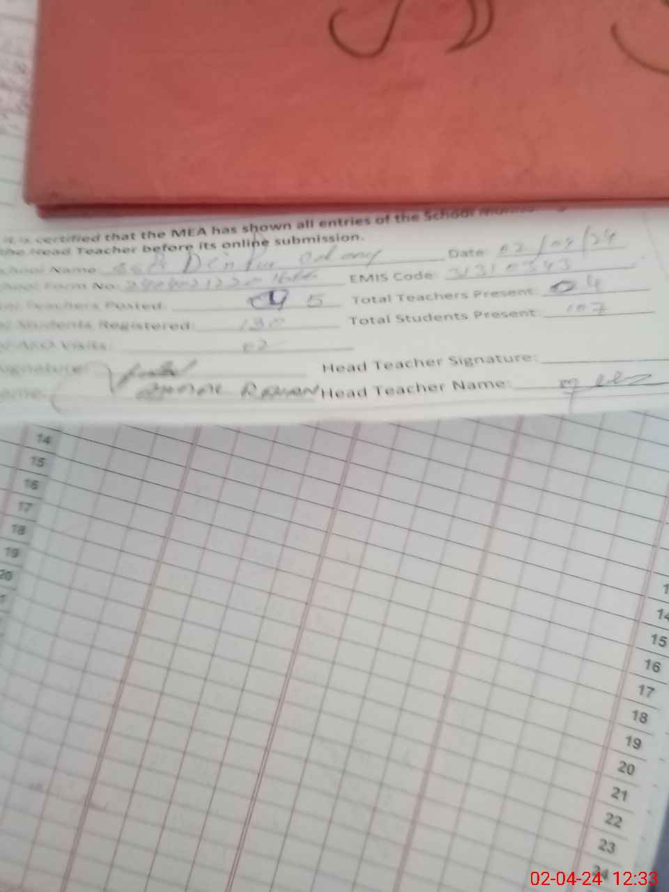 | Attendance Register | Head Teacher | MEA with School | Visit Proof |