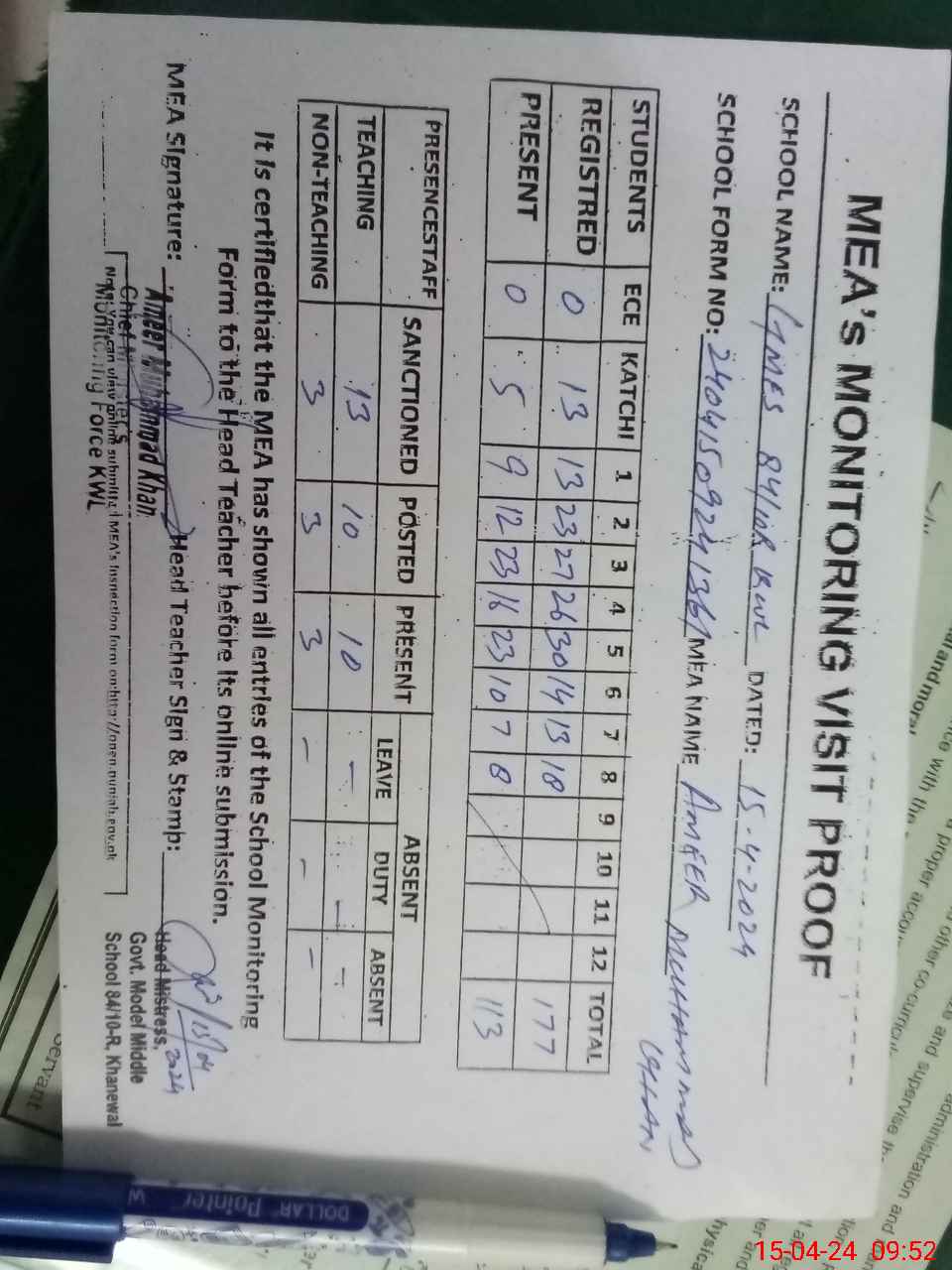 | Attendance Register | Head Teacher | MEA with School | Visit Proof |
