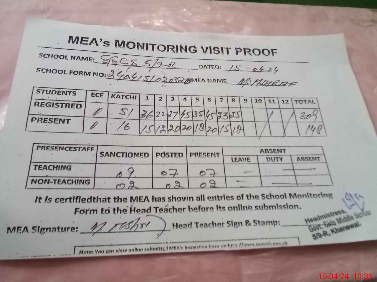 | Attendance Register | Head Teacher | MEA with School | Visit Proof |