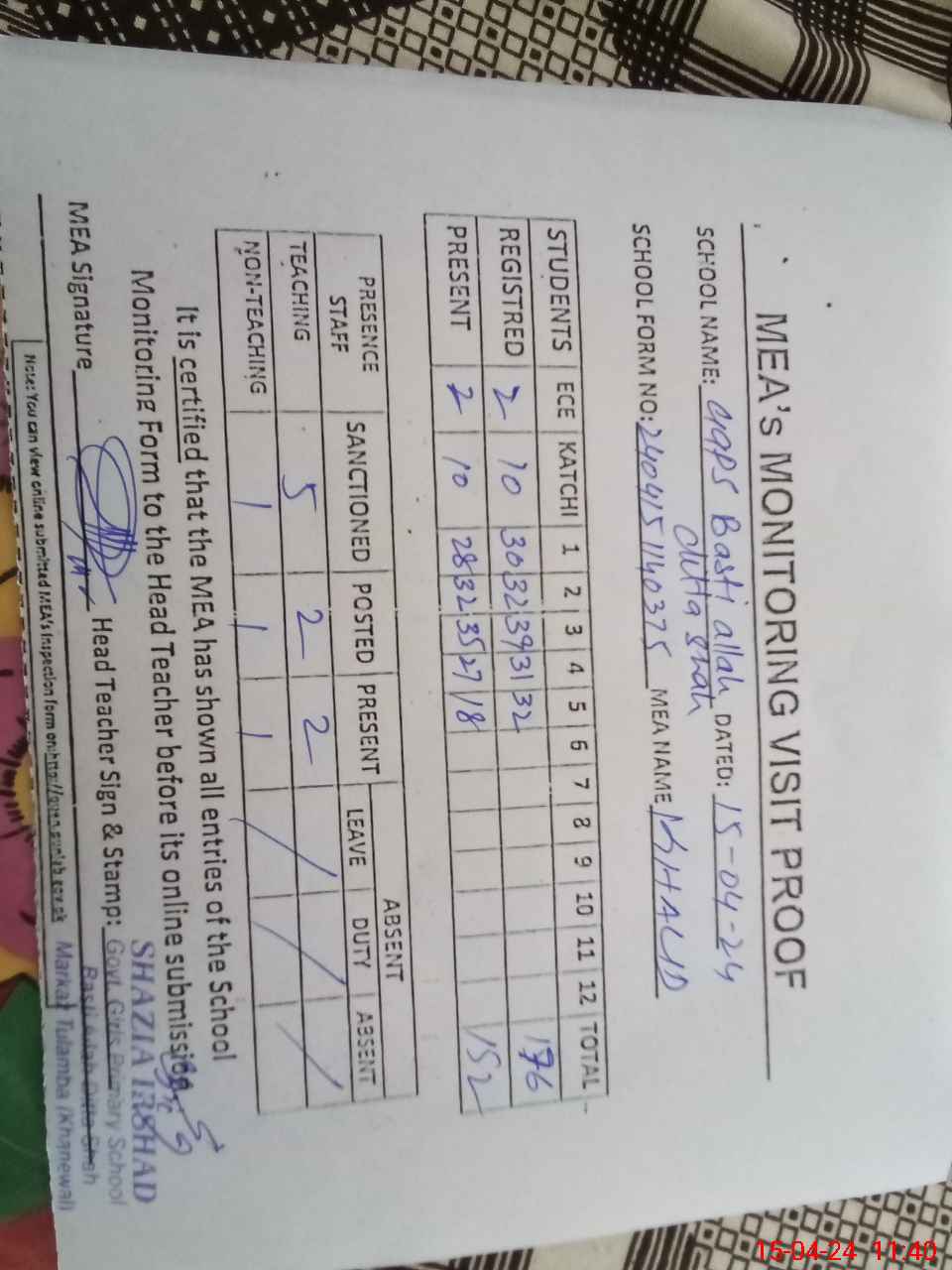 | Certified that this School was Inspected by the Undersigned MEA/DMO Today and the Information Stated Above is as Per Record. | |||||