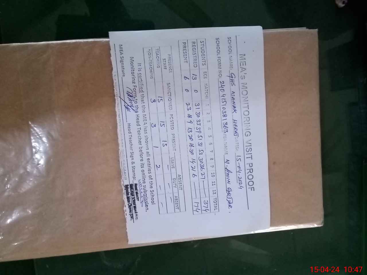| Attendance Register | Head Teacher | MEA with School | Visit Proof |