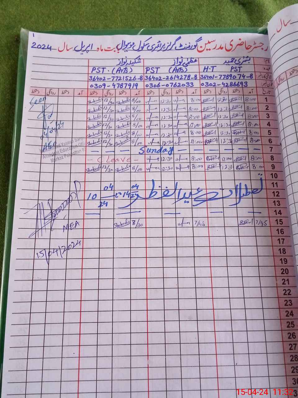 | Name: Uz**** Na**** Designation: (School Headmaster's/Headmistress's) PST Phone/Cell Number: 03**** |