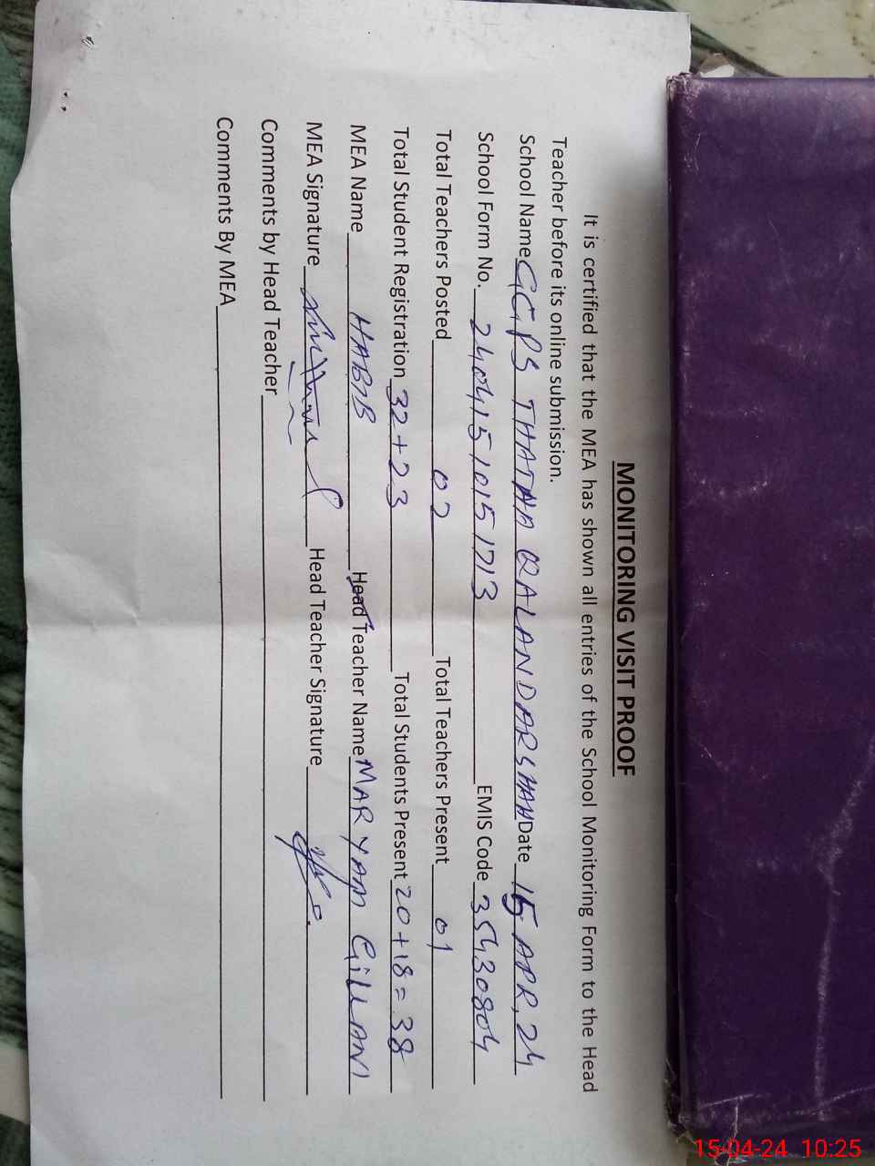 | Attendance Register | Head Teacher | MEA with School | Visit Proof |