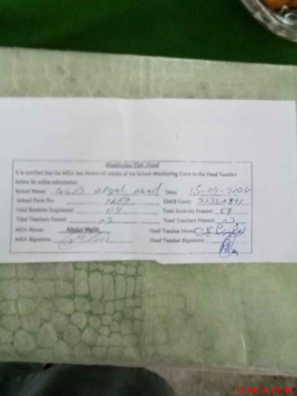 | Attendance Register | Head Teacher | MEA with School | Visit Proof |