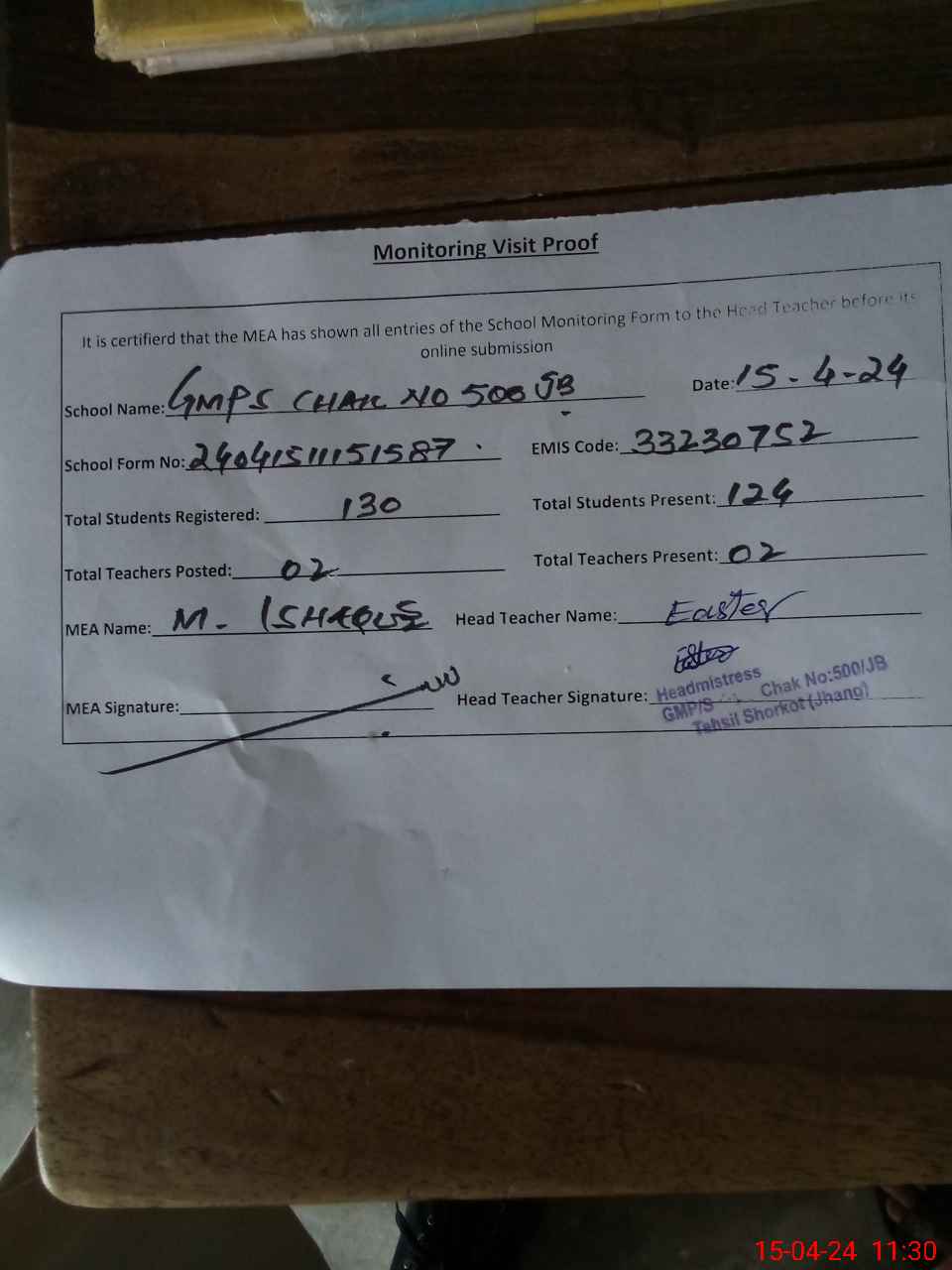 | EMIS Code: 33230752 | Name of School: GMPS CHAK NO. 500 JB | |||