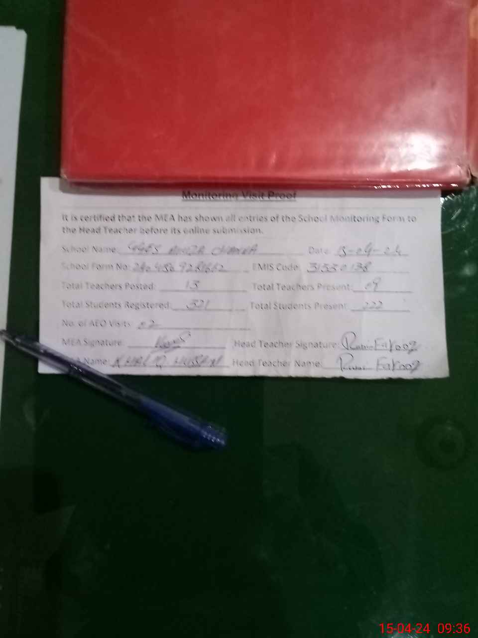 | Attendance Register | Head Teacher | MEA with School | Visit Proof |