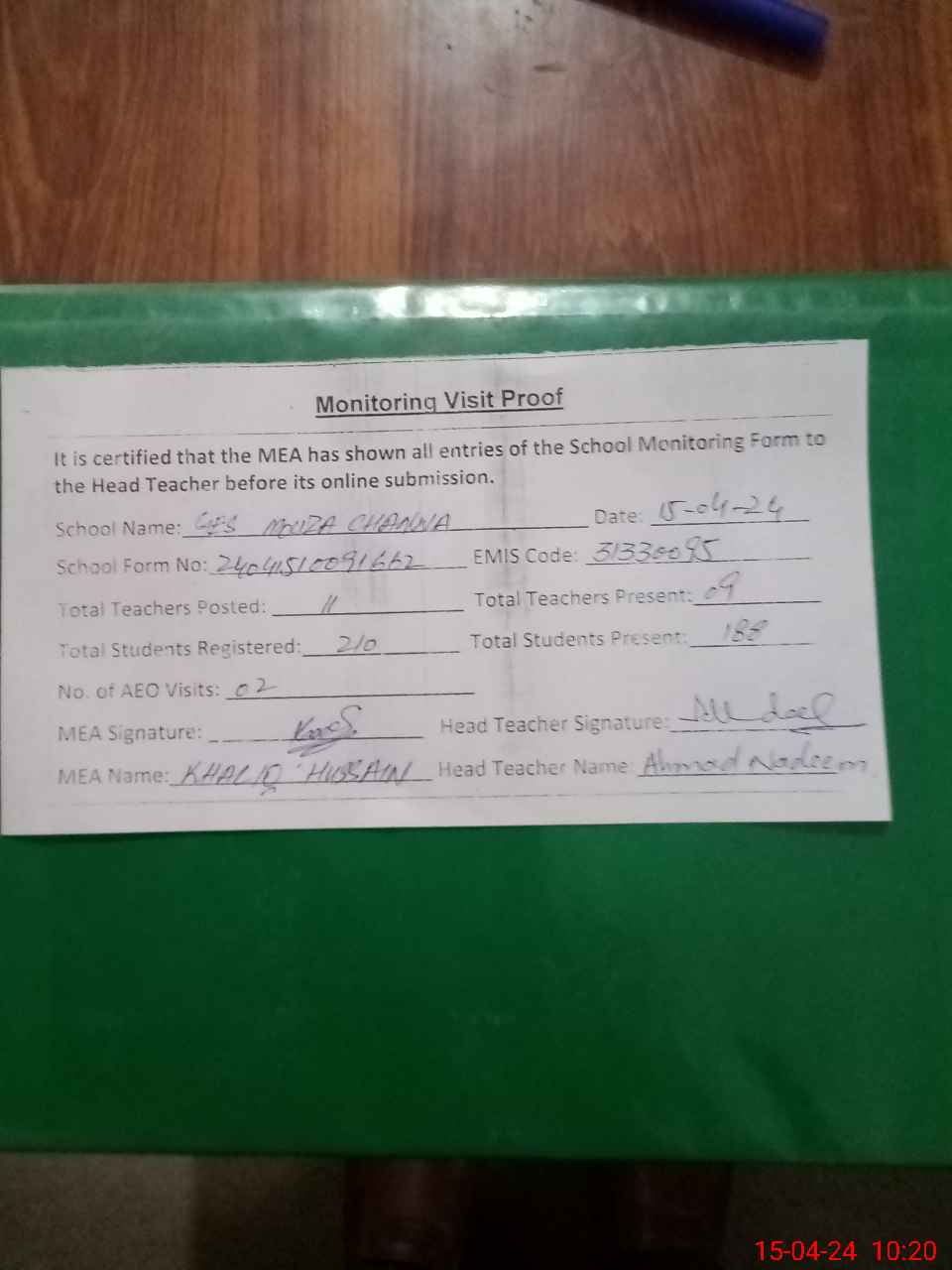 | Attendance Register | Head Teacher | MEA with School | Visit Proof |