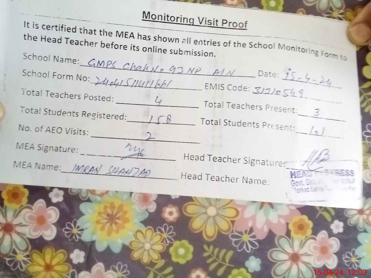 | EMIS Code: 31310549 | Name of School: GMPS CHAK NO. 93/NP (After Noon) | |||