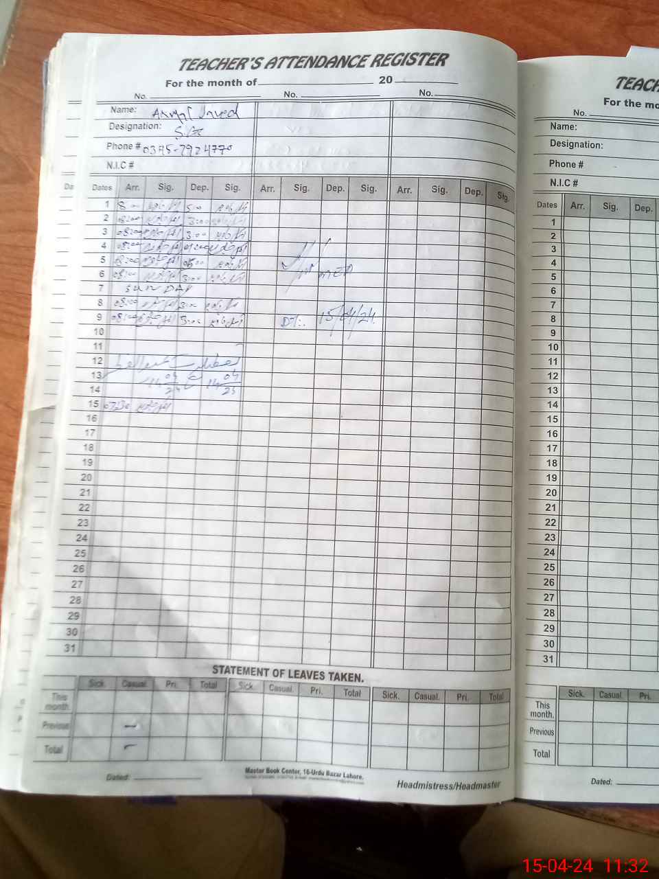 | Name: MIR**** AH**** Designation: (School Headmaster's/Headmistress's) SR.HM Phone/Cell Number: 03**** |