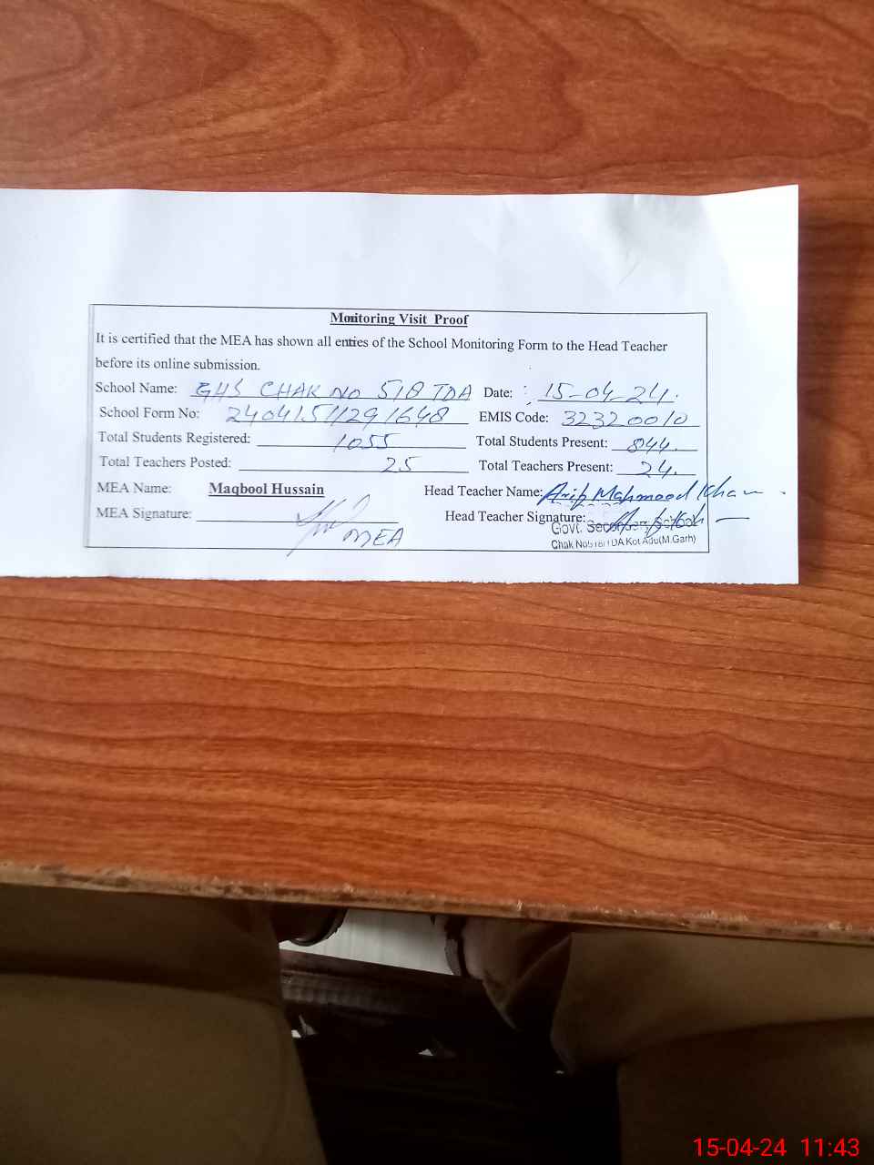 | Certified that this School was Inspected by the Undersigned MEA/DMO Today and the Information Stated Above is as Per Record. | |||||