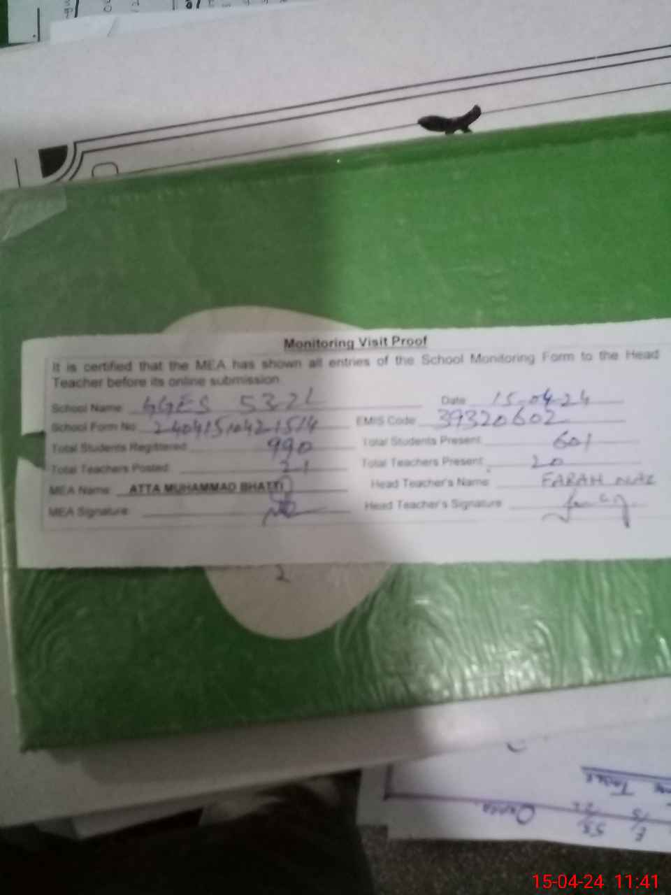 | Attendance Register | Head Teacher | MEA with School | Visit Proof |