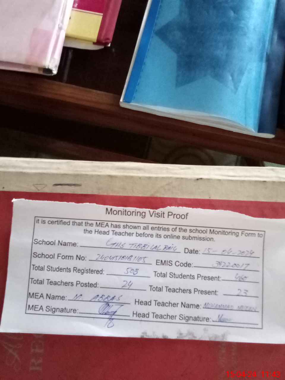 | Attendance Register | Head Teacher | MEA with School | Visit Proof |