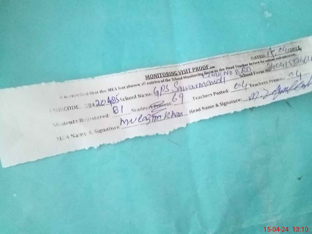 | Attendance Register | Head Teacher | MEA with School | Visit Proof |