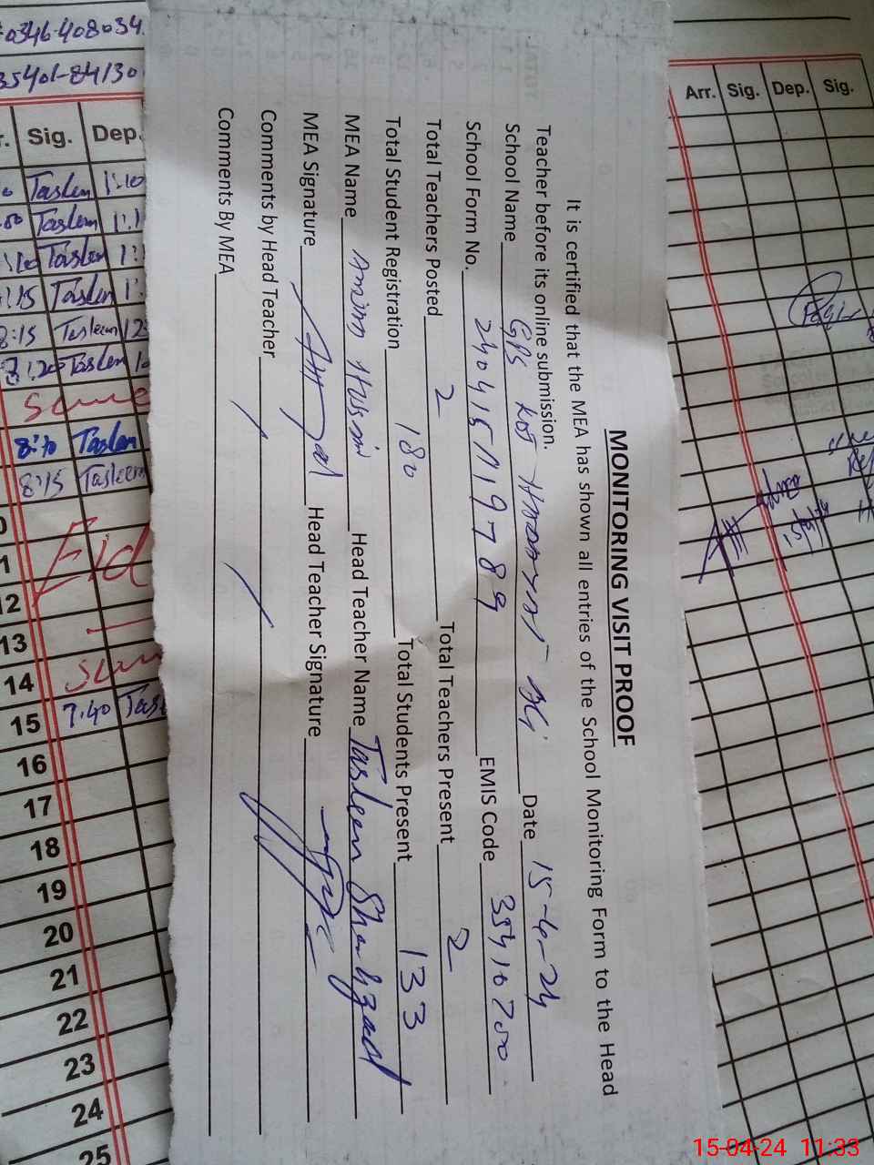 | Attendance Register | Head Teacher | MEA with School | Visit Proof |