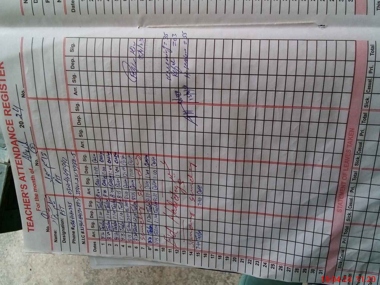 | CNIC | Full Name | Designation | R/C | Absence During Last Calender Month |
