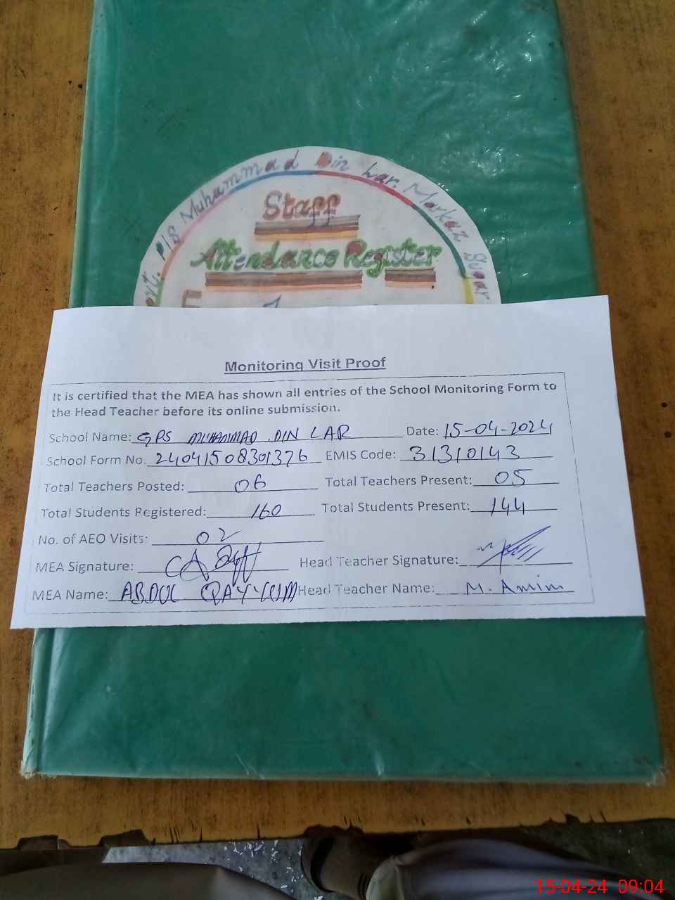 | Attendance Register | Head Teacher | MEA with School | Visit Proof |