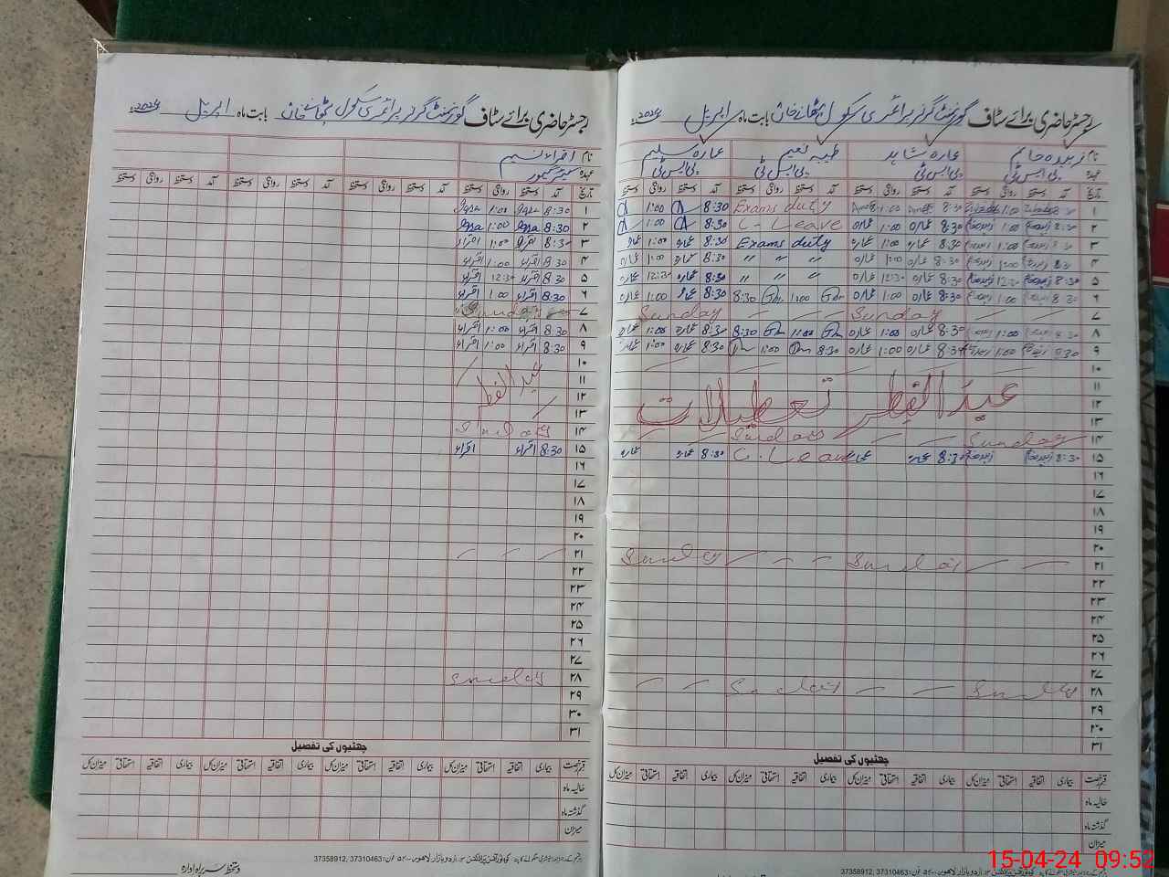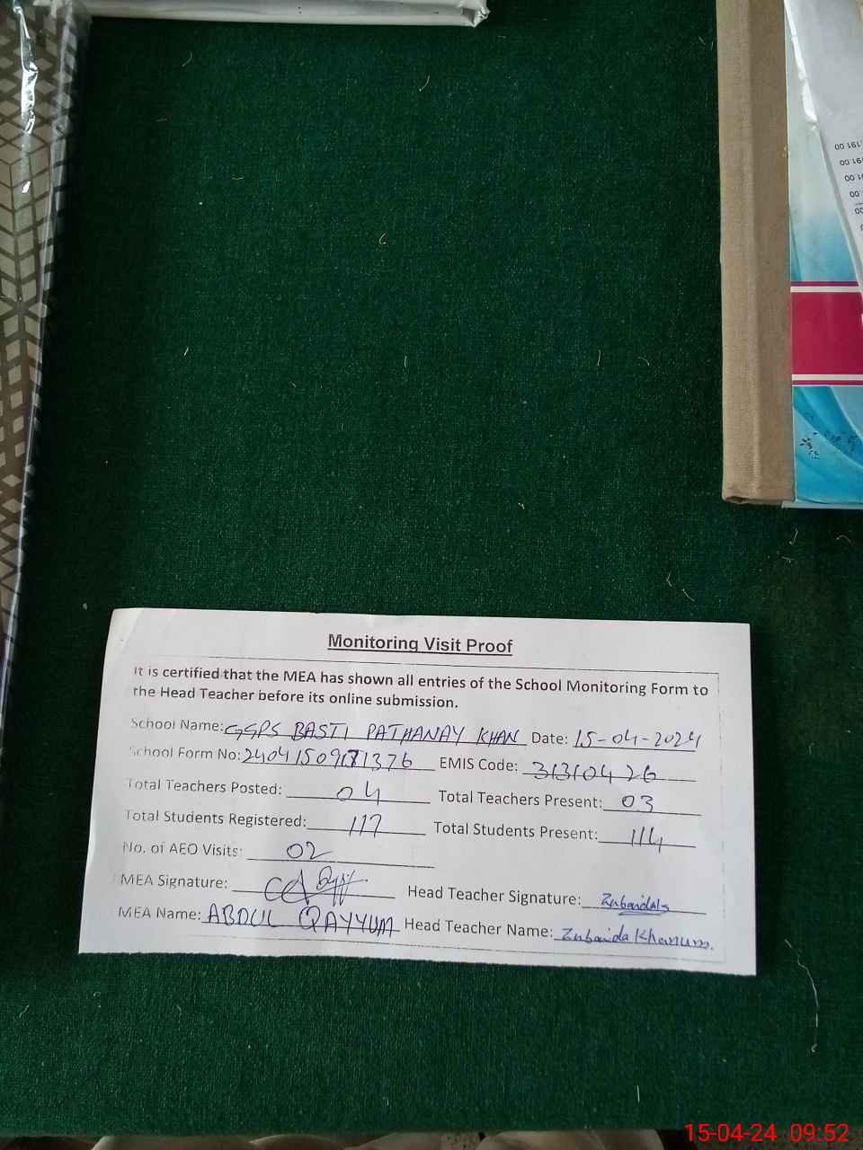 | Name: Zu**** Kh**** Designation: (School Headmaster's/Headmistress's) PST Phone/Cell Number: 03**** |