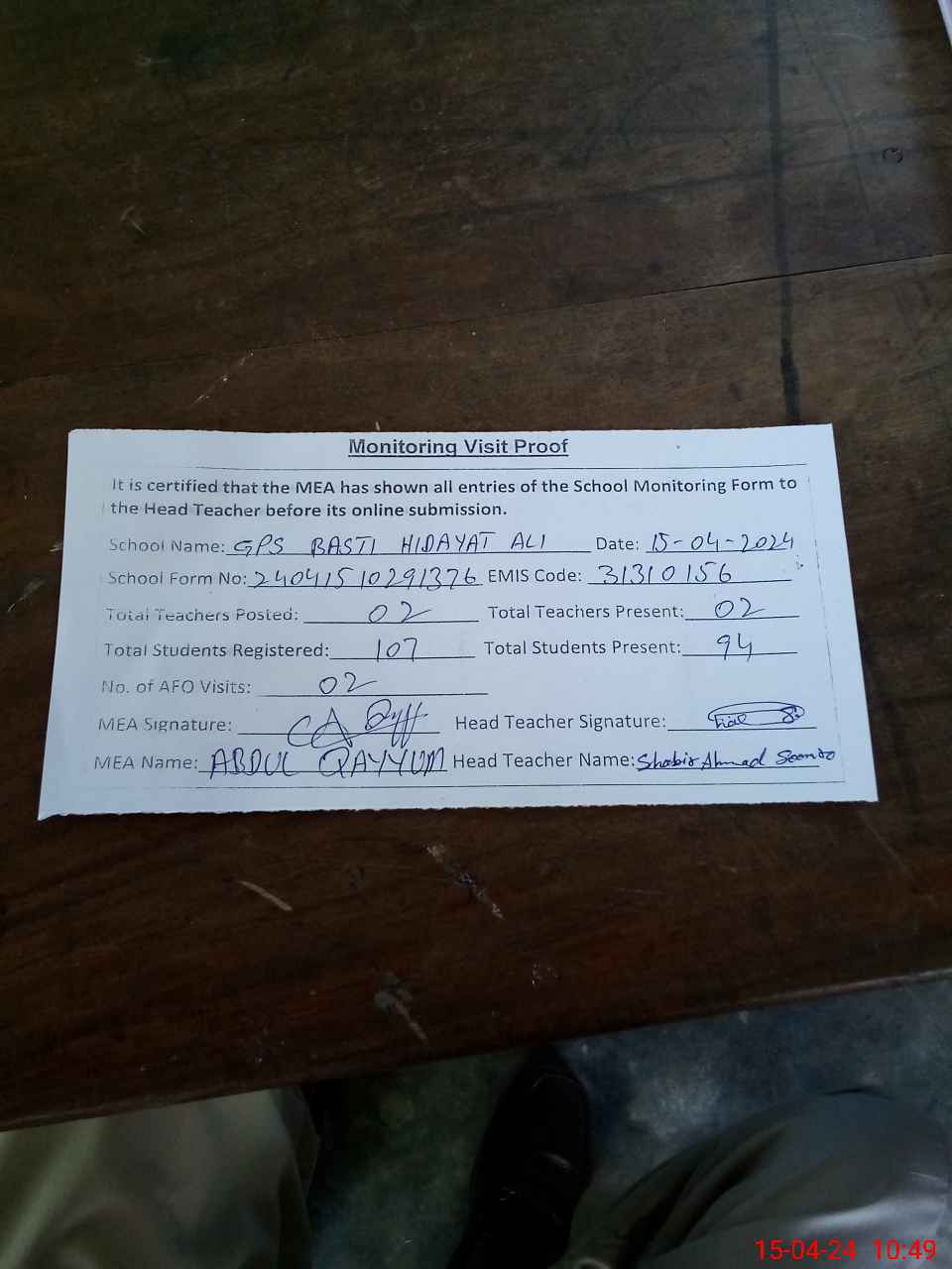 | Attendance Register | Head Teacher | MEA with School | Visit Proof |