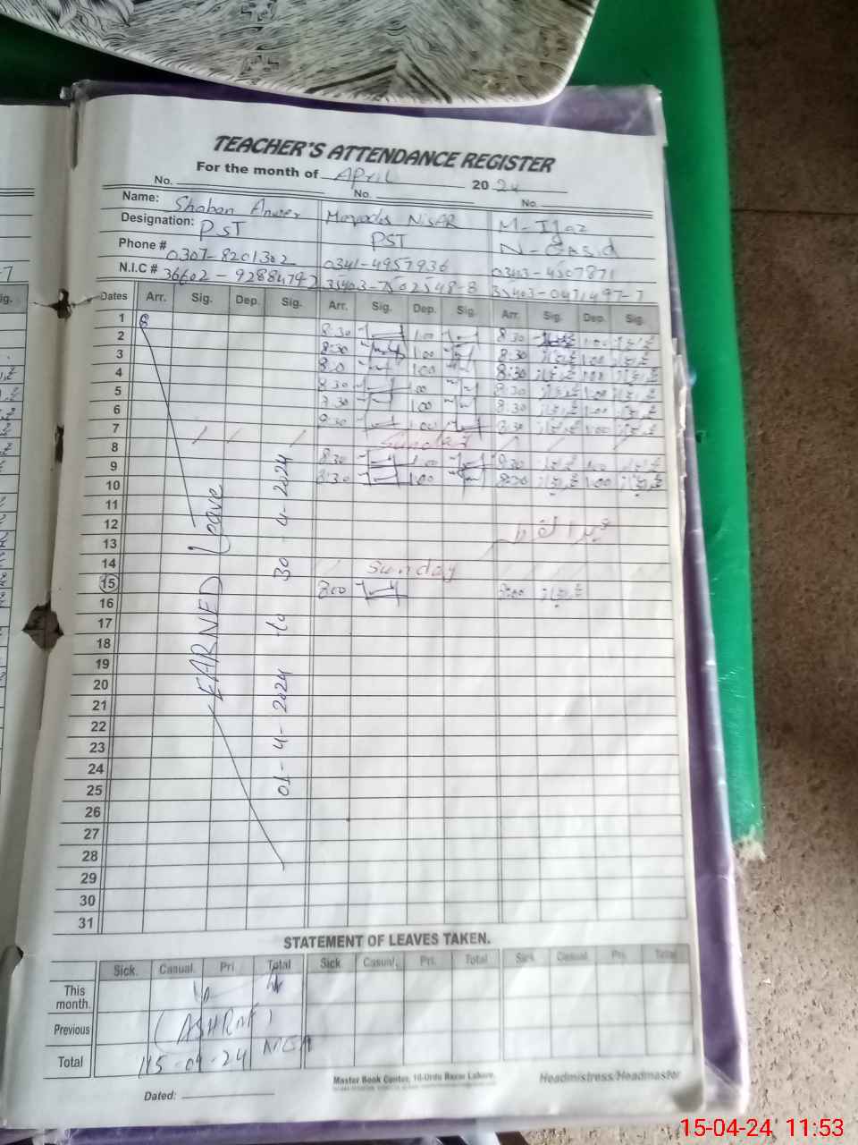 | CNIC | Full Name | Designation | R/C | Absence During Last Calender Month |