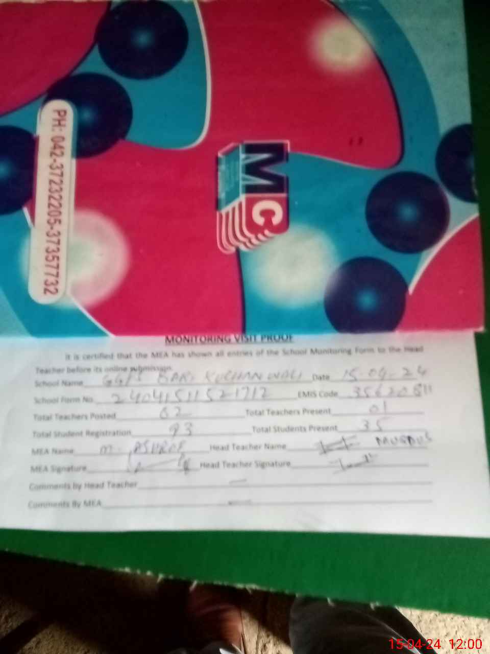 | Attendance Register | Head Teacher | MEA with School | Visit Proof |