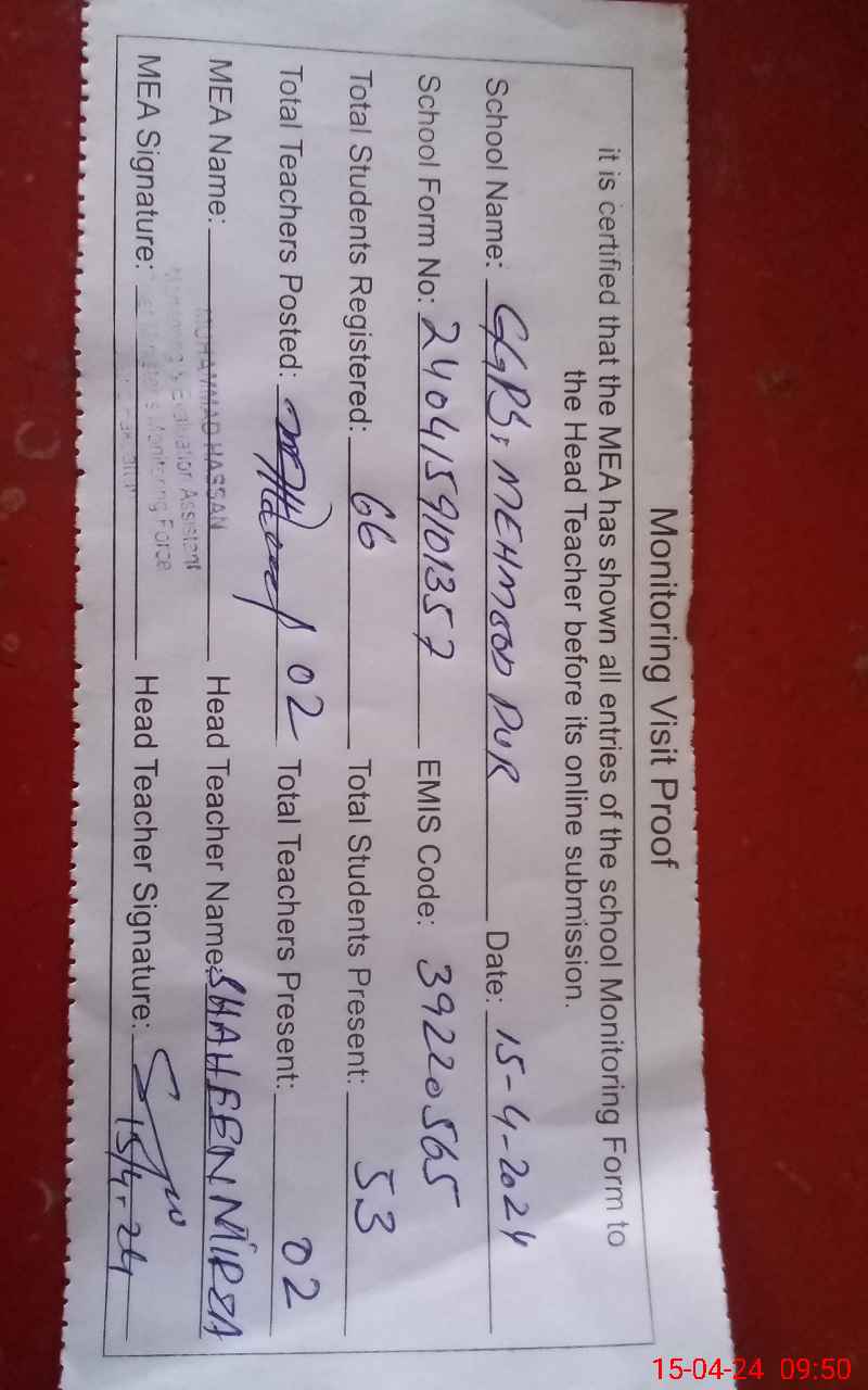 | EMIS Code: 39220565 | Name of School: GGPS MEHMOOD PUR | |||