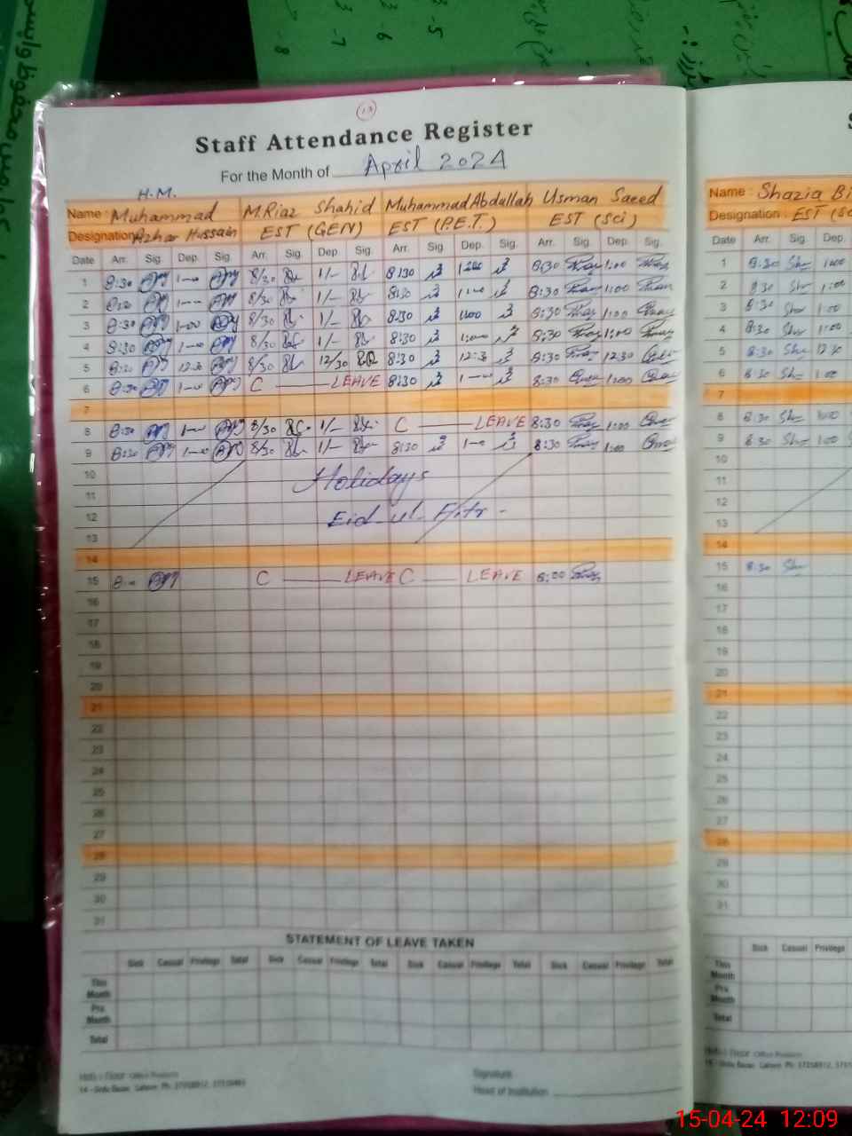 | CNIC | Full Name | Designation | R/C | Absence During Last Calender Month |