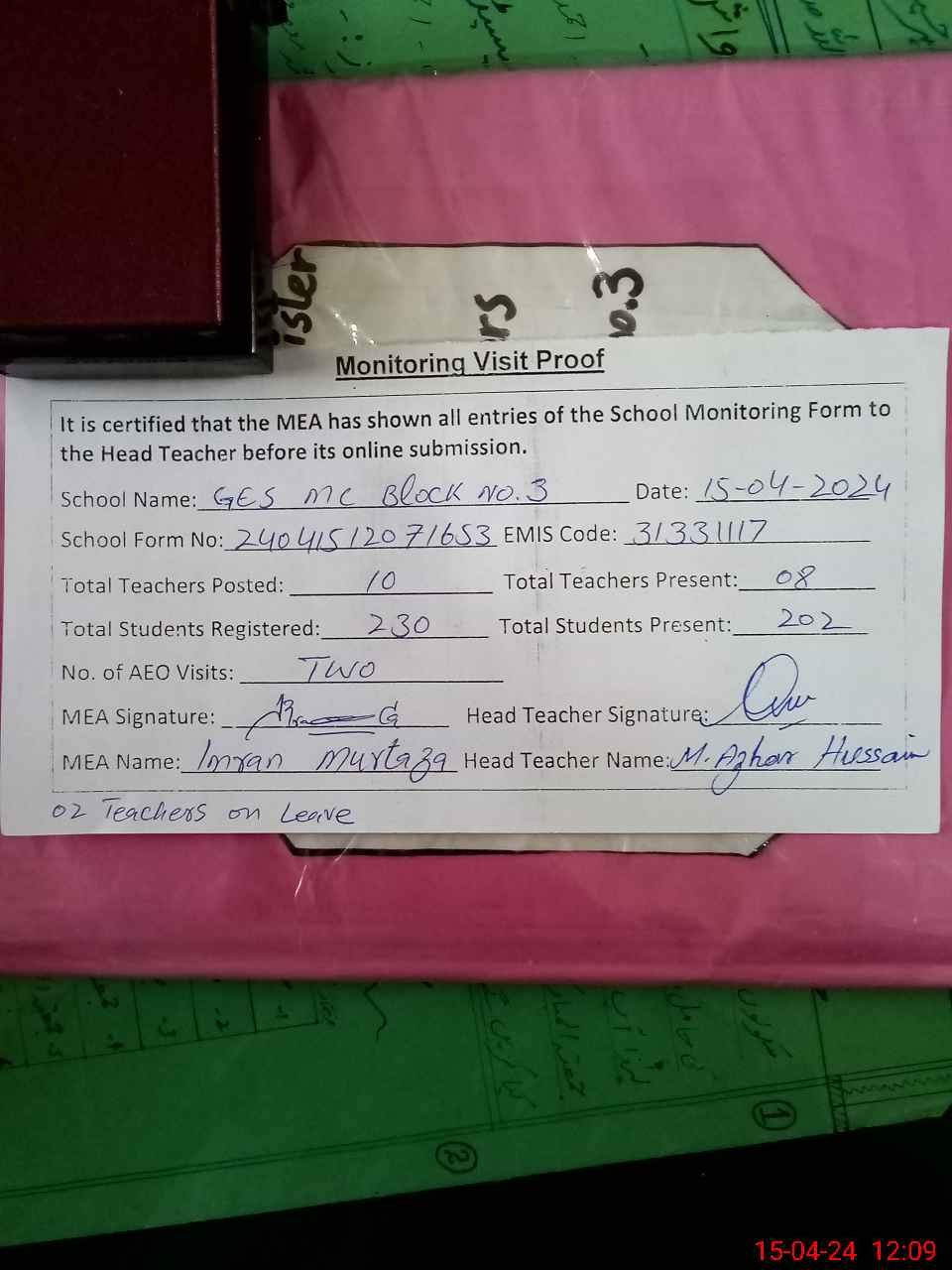 | Attendance Register | Head Teacher | MEA with School | Visit Proof |