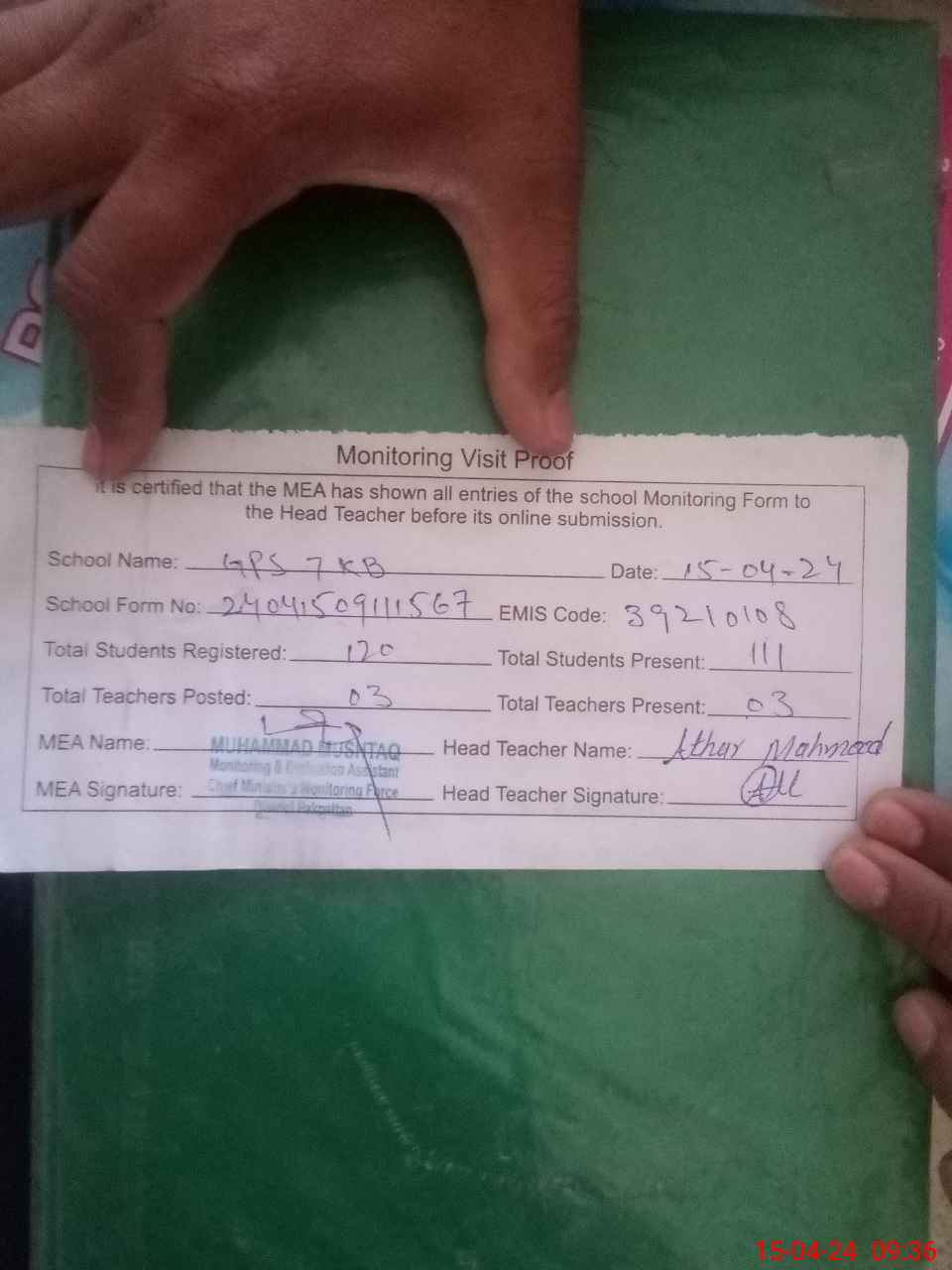 | Attendance Register | Head Teacher | MEA with School | Visit Proof |