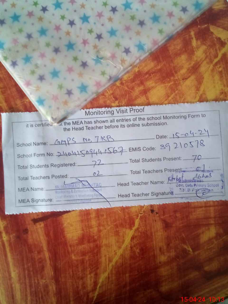 | Attendance Register | Head Teacher | MEA with School | Visit Proof |