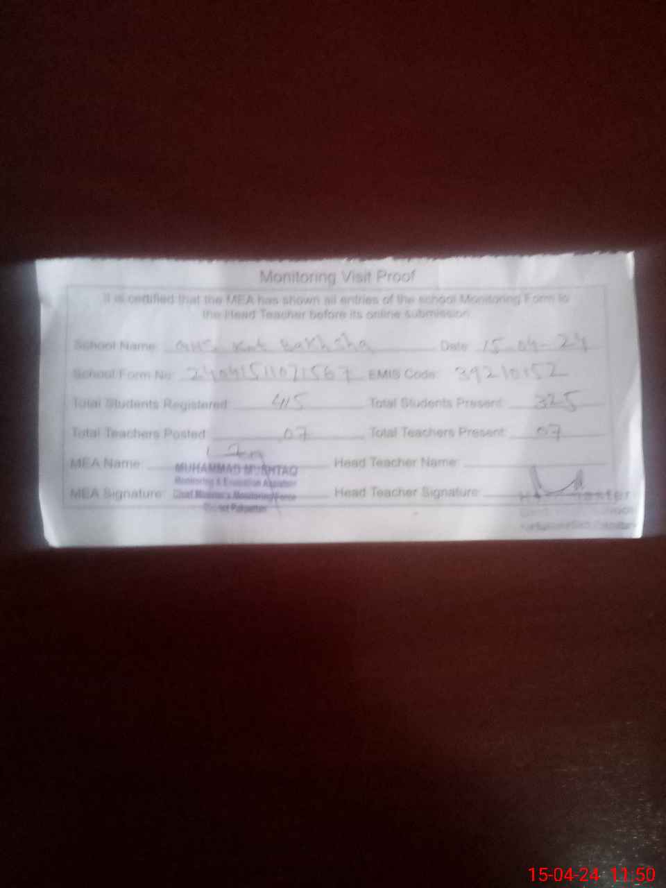| Attendance Register | Head Teacher | MEA with School | Visit Proof |