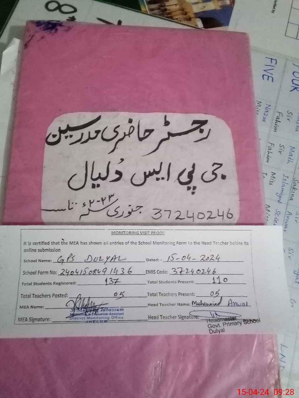 | Attendance Register | Head Teacher | MEA with School | Visit Proof |