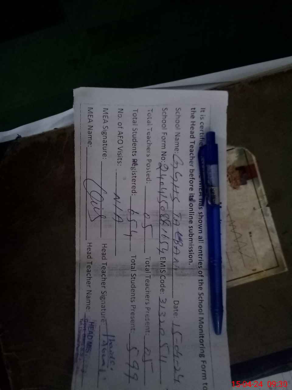 | Attendance Register | Head Teacher | MEA with School | Visit Proof |