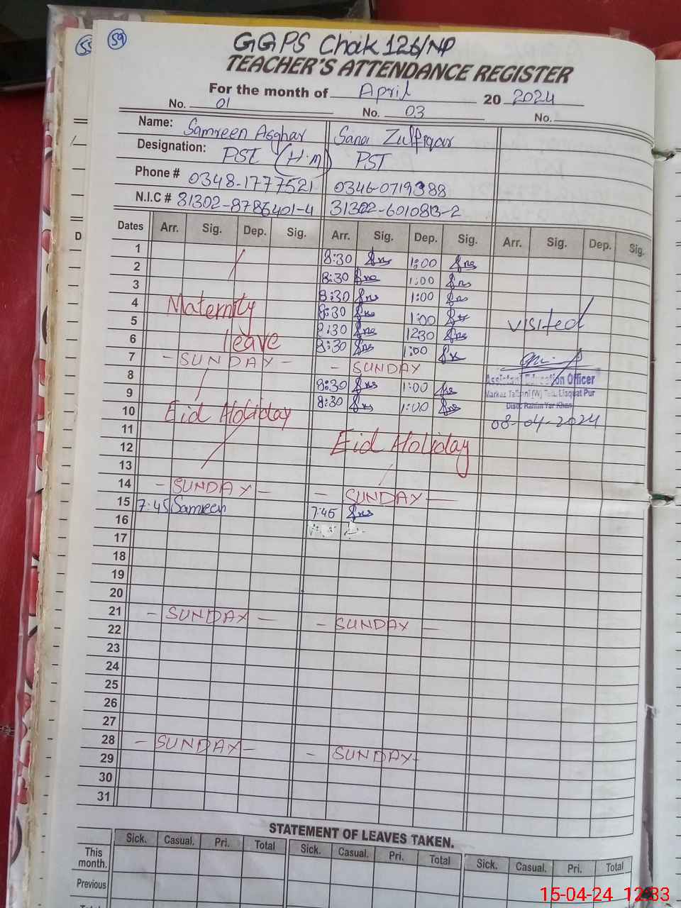 | Name: SA**** AS**** Designation: (School Headmaster's/Headmistress's) PST Phone/Cell Number: 03**** |