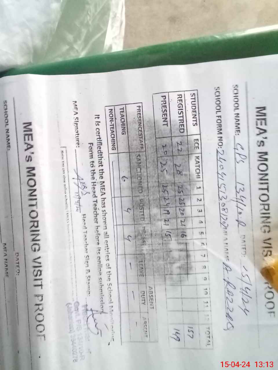 | Attendance Register | Head Teacher | MEA with School | Visit Proof |