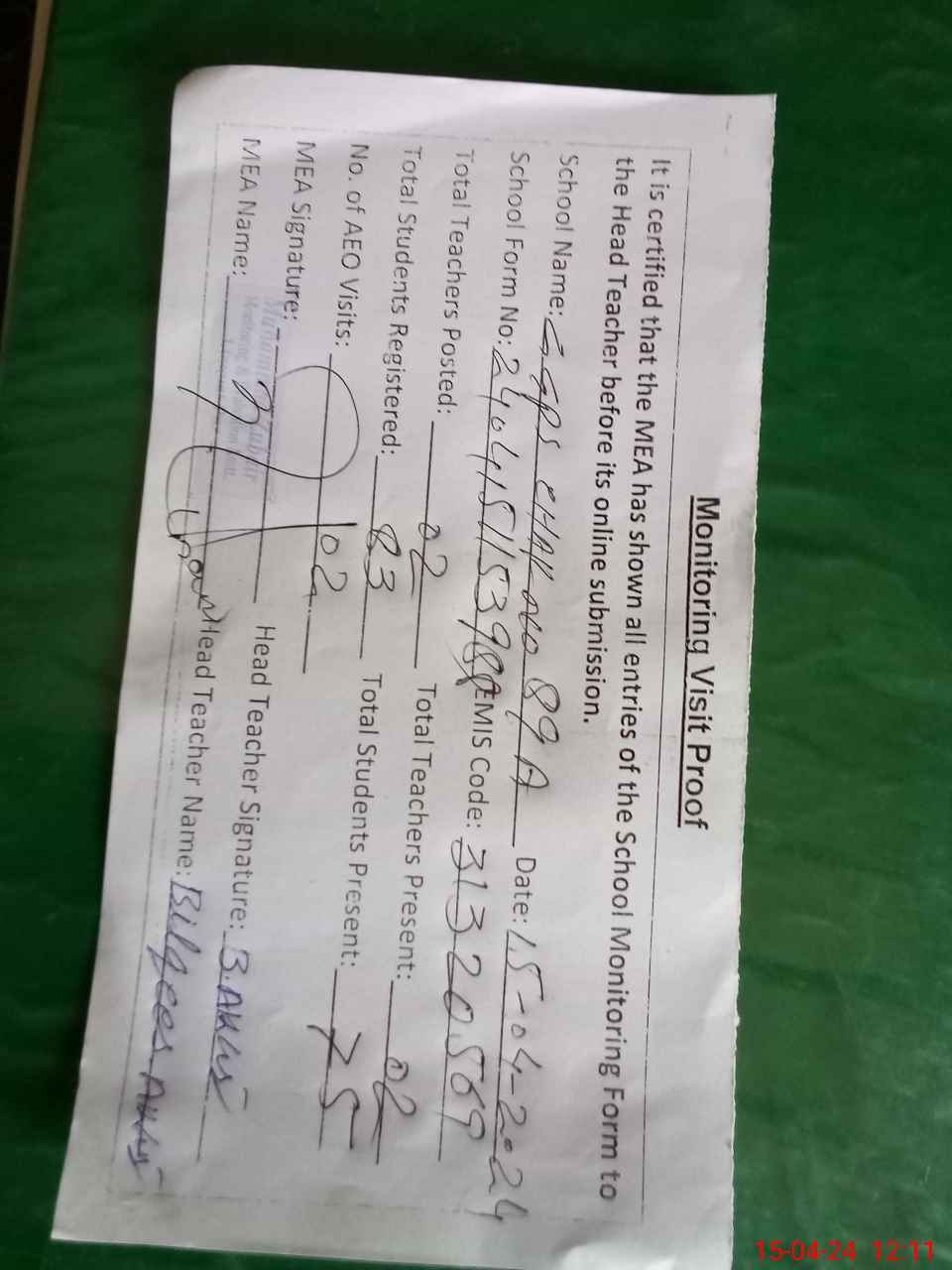 | EMIS Code: 31320569 | Name of School: GGPS CHAK NO 89/A | |||