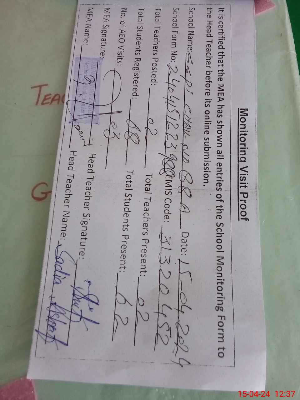 | Attendance Register | Head Teacher | MEA with School | Visit Proof |