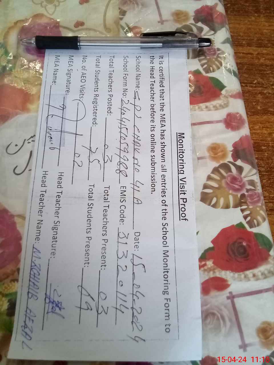 | Attendance Register | Head Teacher | MEA with School | Visit Proof |