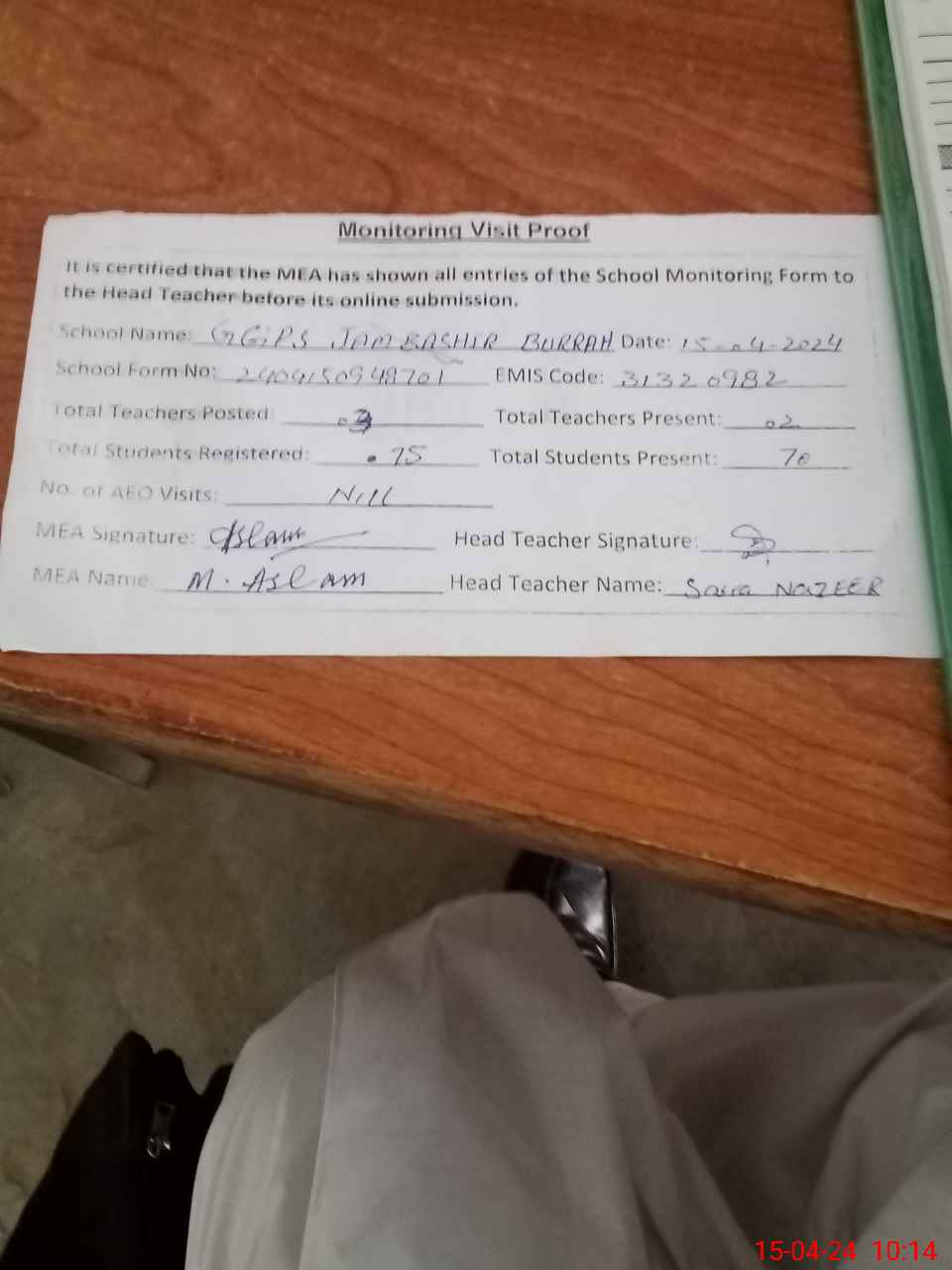 | Attendance Register | Head Teacher | MEA with School | Visit Proof |